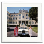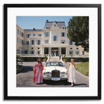 Guests standing by a white Rolls-Royce convertible courtesy car at the Hotel du Cap-Eden-Roc, Antibes, France, August 1976.