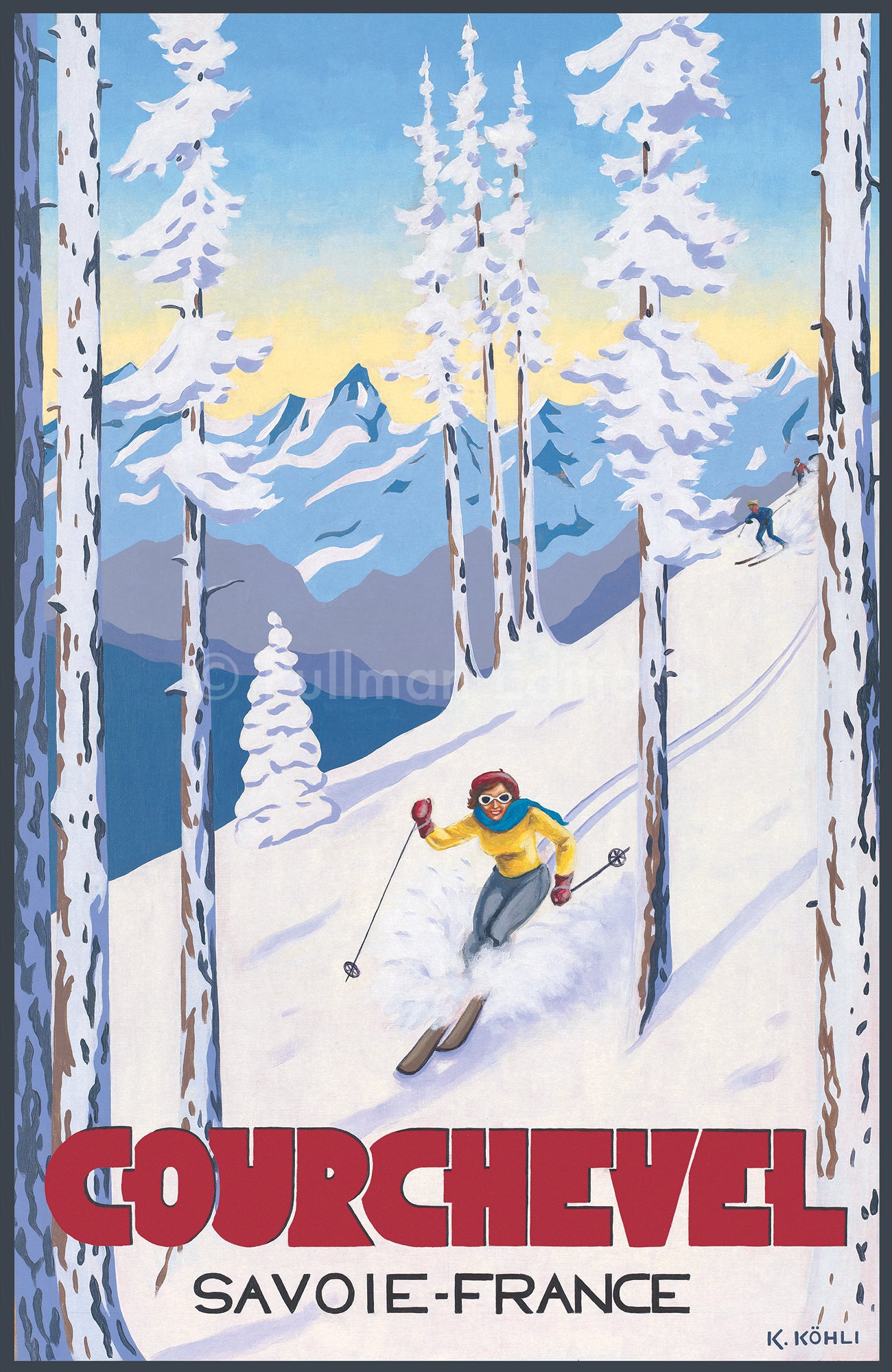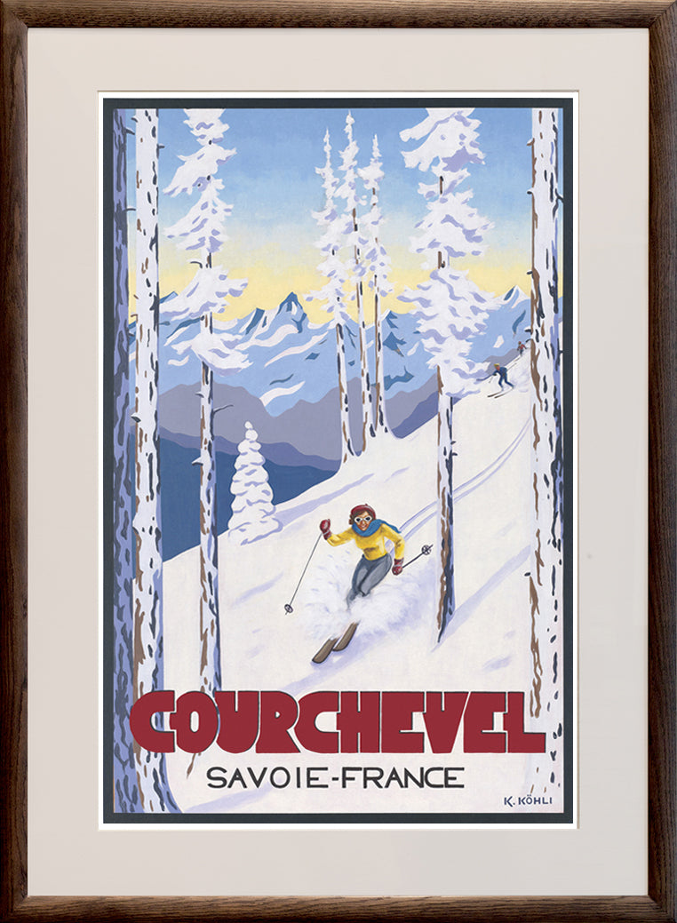 This print by Katrine Kohli features Courchevel, one of the most acclaimed resorts in Les Trois Vallées. Spread over five towns, each named for their altitudes in metres, true village life exists in harmony with majestic Olympic jumping slopes and some of the best forest skiing in France.