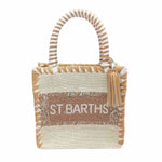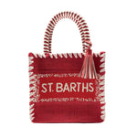 A vibrant mini tote by De Siena, crafted with textured woven fabric and finished with hand-embroidered “St Barths” lettering. The structured silhouette is complemented by striped handles and a decorative tassel, giving it a playful yet refined resort feel.
