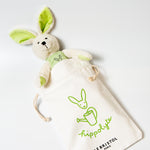 Features: soft toy rabbit with green branded apron. Includes a cotton drawstring carry bag.